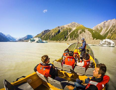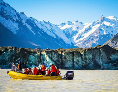 库克山顶峰终年被冰雪覆盖,群山谷地里的塔斯曼冰川(Tasman Glacier)长约27公里,平均宽度达2公里,厚度600米,景色壮观,是新西兰最长的冰河。有公路和徒步路线可以接近这条冰川。大巴将您带至塔斯曼山谷,30分钟徒步国家公园,穿过一路的冰堆石,登上专门制造的冰川游船MAC,欣赏变换不尽的景色,在安全距离内领略塔斯曼冰川千奇百怪形状各异的冰帽和冰峰,有机会去尝一尝有300-500年久远的冰晶。全程大约2.5个小时,其中包括45分钟至一个小时的冰川湖游览。