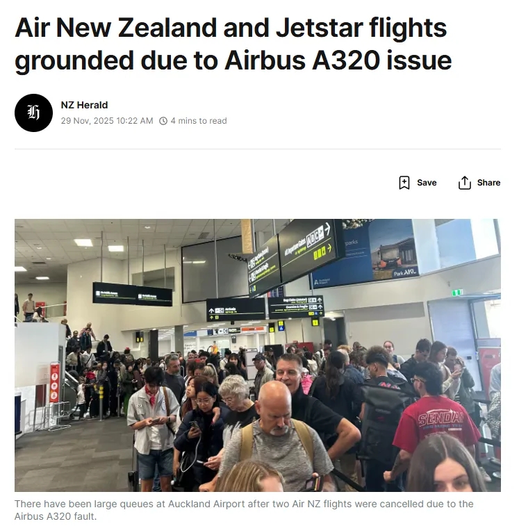 今天早上,很多正准备搭乘新西兰航空和捷星航空的乘客突然收到了“航班取消”通知,机场一度陷入混乱。 空客A320飞机因软件问题而受到全球性影响,需要进行软件更新才能恢复飞行。 而A320是新西兰境内航班重要机型,这导致各地旅客遭遇长达六小时的排队、航班取消…… 今天上午从奥克兰飞往皇后镇的新西兰航空NZ611航班...